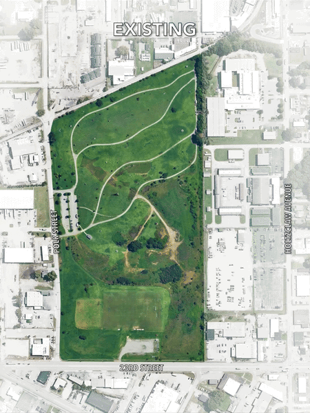 Though the eastern edge of the park is currently “landlocked” by its neighbors, two opportunities for eastern connectivity manifest themselves in the former Rights of Way of 18th Street (once known as “Montague Street”) and 21st street. These connections will provide easier access to the highly populated neighborhoods of Highland Park, Ridgedale, Oak Grove, and Ferger Place to the east. These direct connections will eliminate the additional ~½ mile of detour that the current entrances on the Polk Street and 23rd Street sides beget.